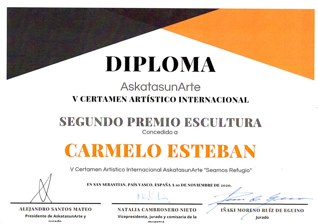 AskatasunARTE ha convocado a los Artistas para que expresen sus inquietudes y reflexiones sobre la problemática de la inmigración.CARMELO ESTEBAN con su obra «ALAS DE LIBERTAD» a calado en la idea del certamen, aportando un bonita reflexión.Consiguiendo el 2 PREMIO DE ESCULTURA.