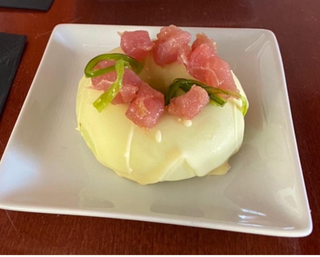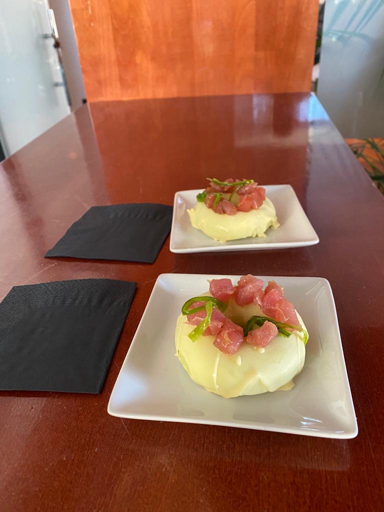 Una elaboración Fascinante de mezclas de texturas de chocolate blanco crujiente por fuera y con la crema de Aguacate en el interior, decorado con trozos de Atún y el Alga Wakame por encima.